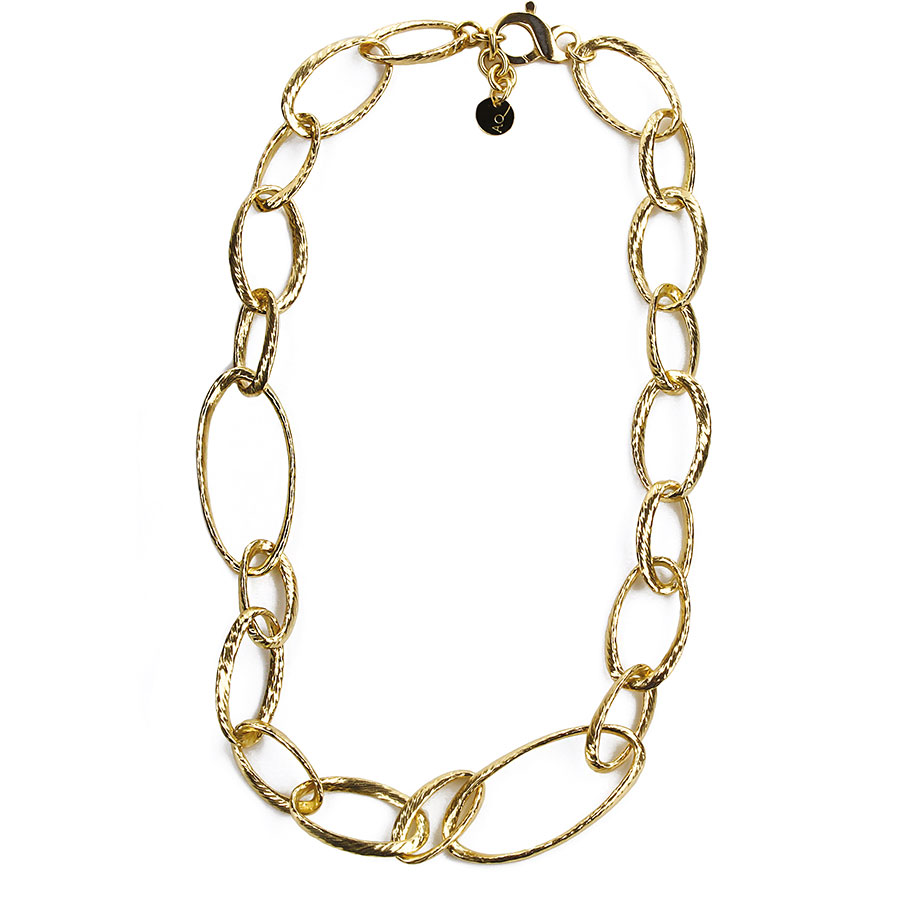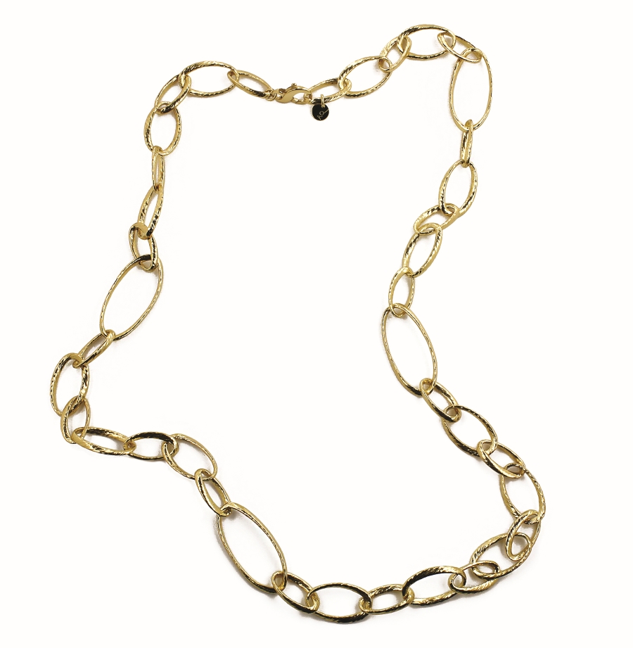 Passion for chains: essential, refined and always trendy accessory. Necklaces, earrings and bracelets are made up of large fused elements of different shapes and lengths, joined together by light chains or counter links.