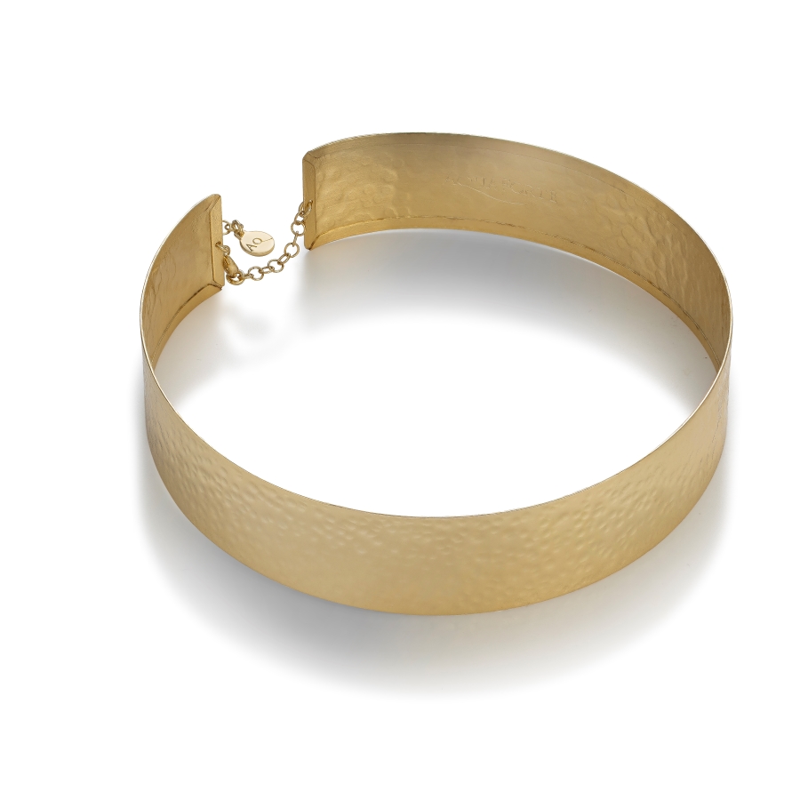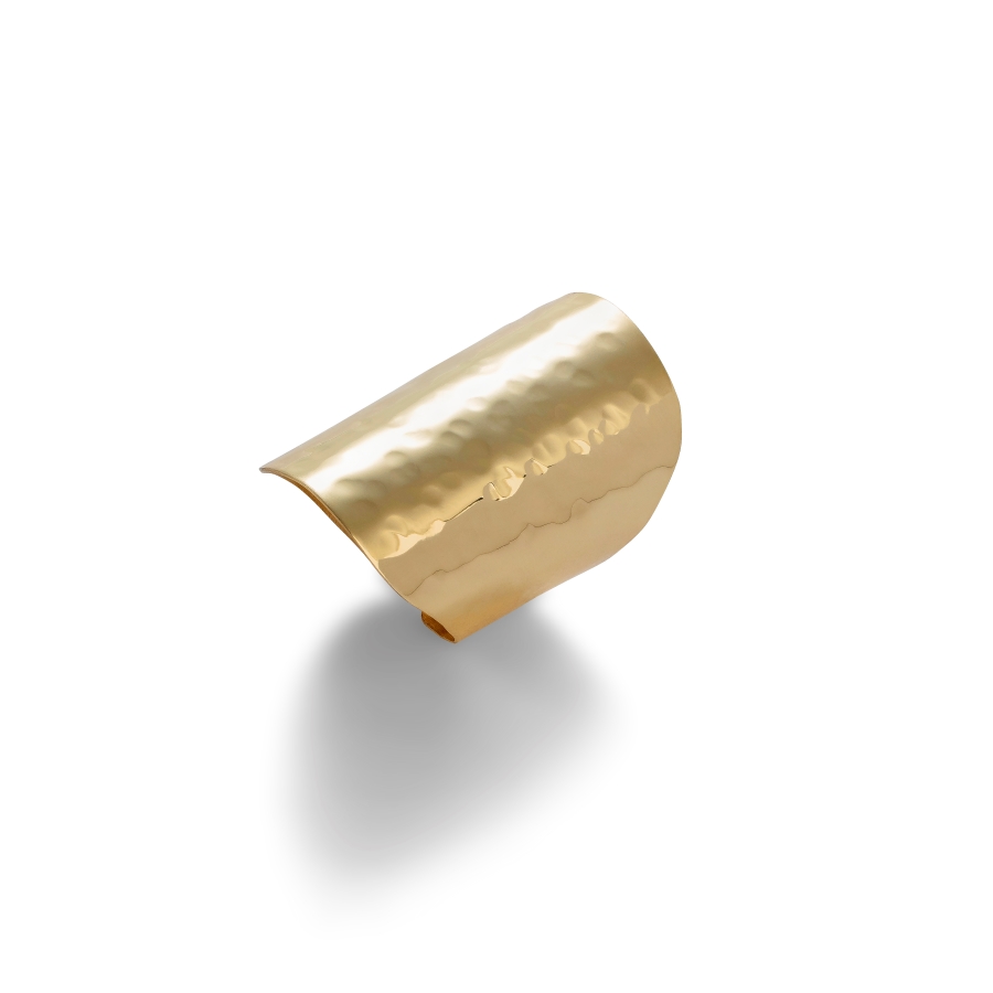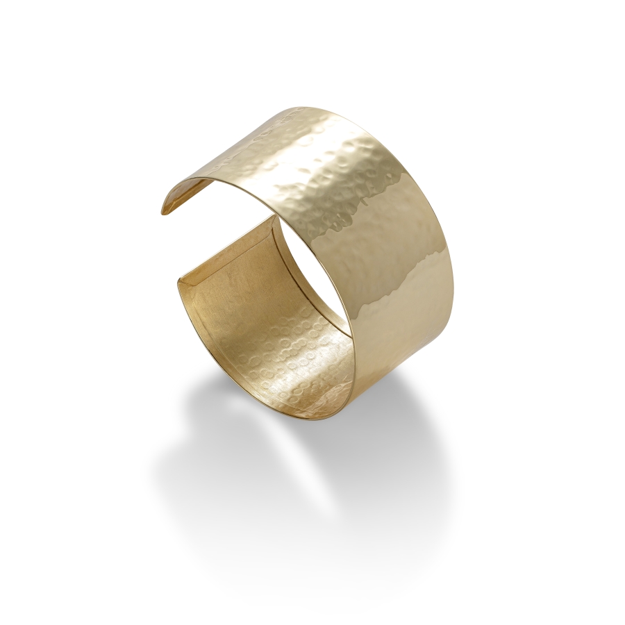 The hammered effect on mirror polished surfaces brings out the 23 carat gold plating.