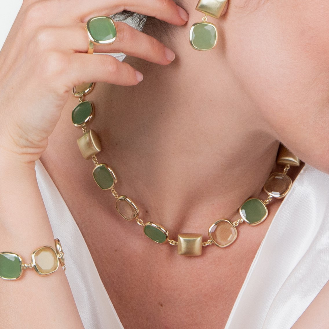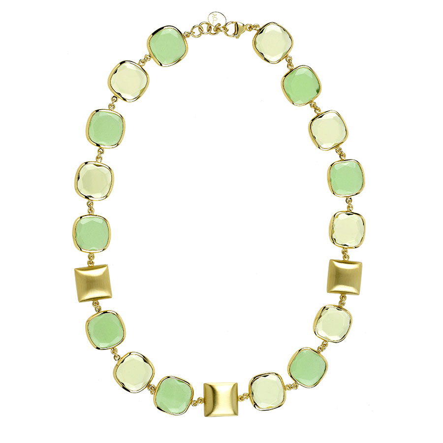 Maxi-size necklace in 23 kt. yellow gold plated 925‰ sterling silver, with paired, square, hand-polished and satin-finished tablets and green faceted glass stone. 93.5 cm.