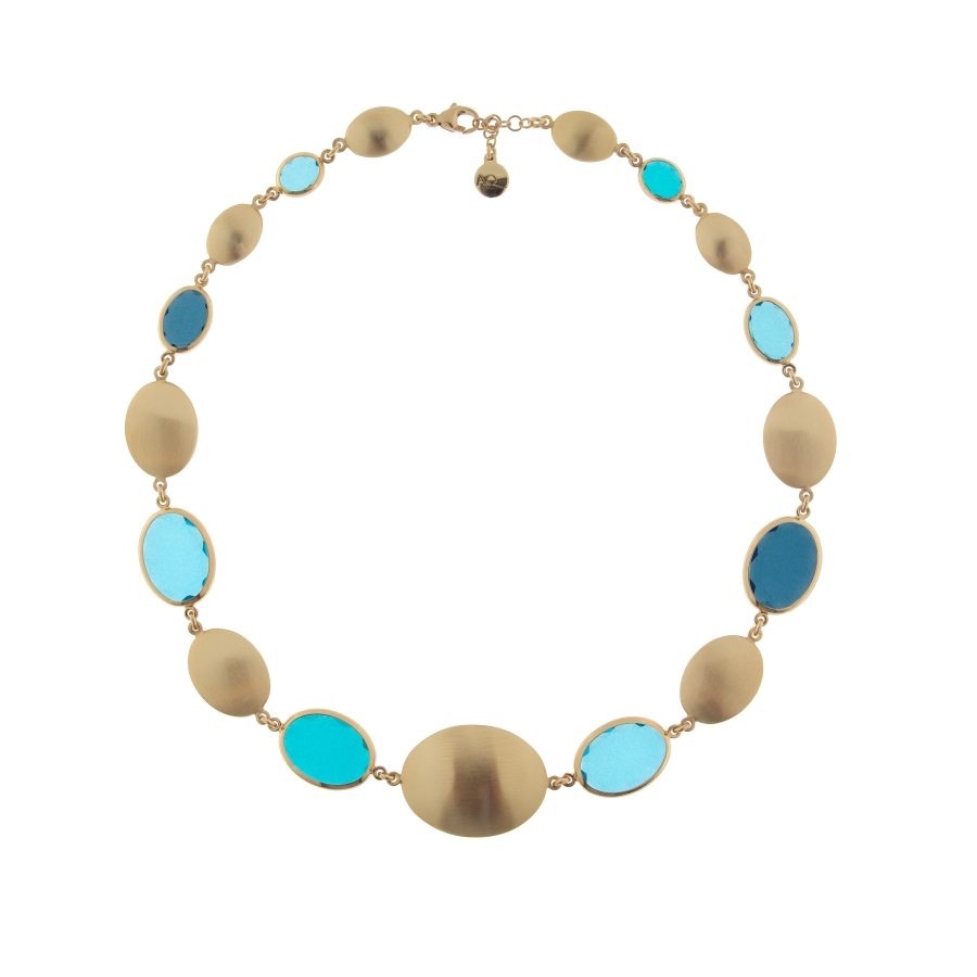 Le classiche “caramelle” ovali , proposte di recente, si vestono ora dei toni del mare: azzurro trasparente, azzurro milky, petrolio chiaro e petrolio scuro, sapientemente mixati per creare dei gioielli che si faranno notare.