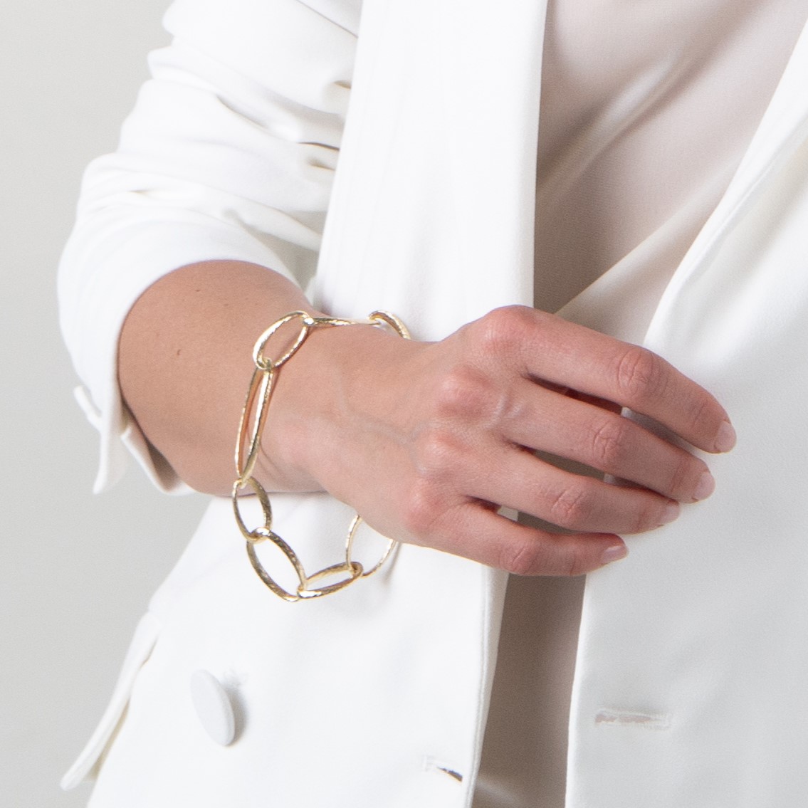 Passione catene: accessorio immancabile, raffinato e sempre di tendenza. Collane, orecchini e braccilai sono costituiti da ampi elementi fusi dalle forme e dalle lunghezze diverse, uniti tra loro da leggere catene o contromaglie.