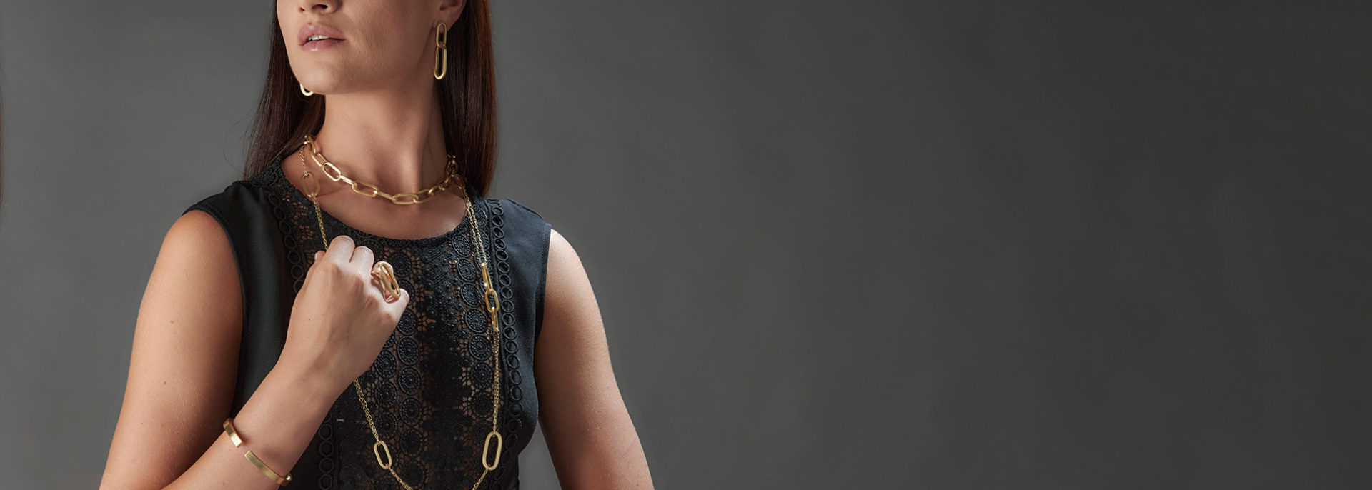 Le maglie si alternano a catene sottili a doppia fila, per un effetto classico, ma distintivo.