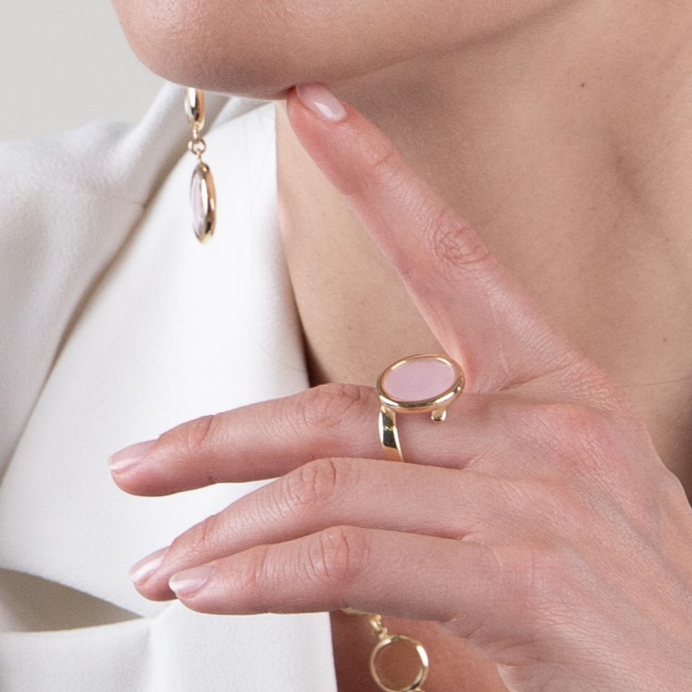 Collana in AG 925‰ placcato oro giallo 23 kt. con pasta vitrea 16mm rosa baby. Lunghezza Cm 42 + ext.