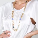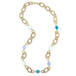 Collana lunga con elementi a lastra e paste vitree ovali nei toni del blu in argento 925‰ placcato oro giallo 23kt.